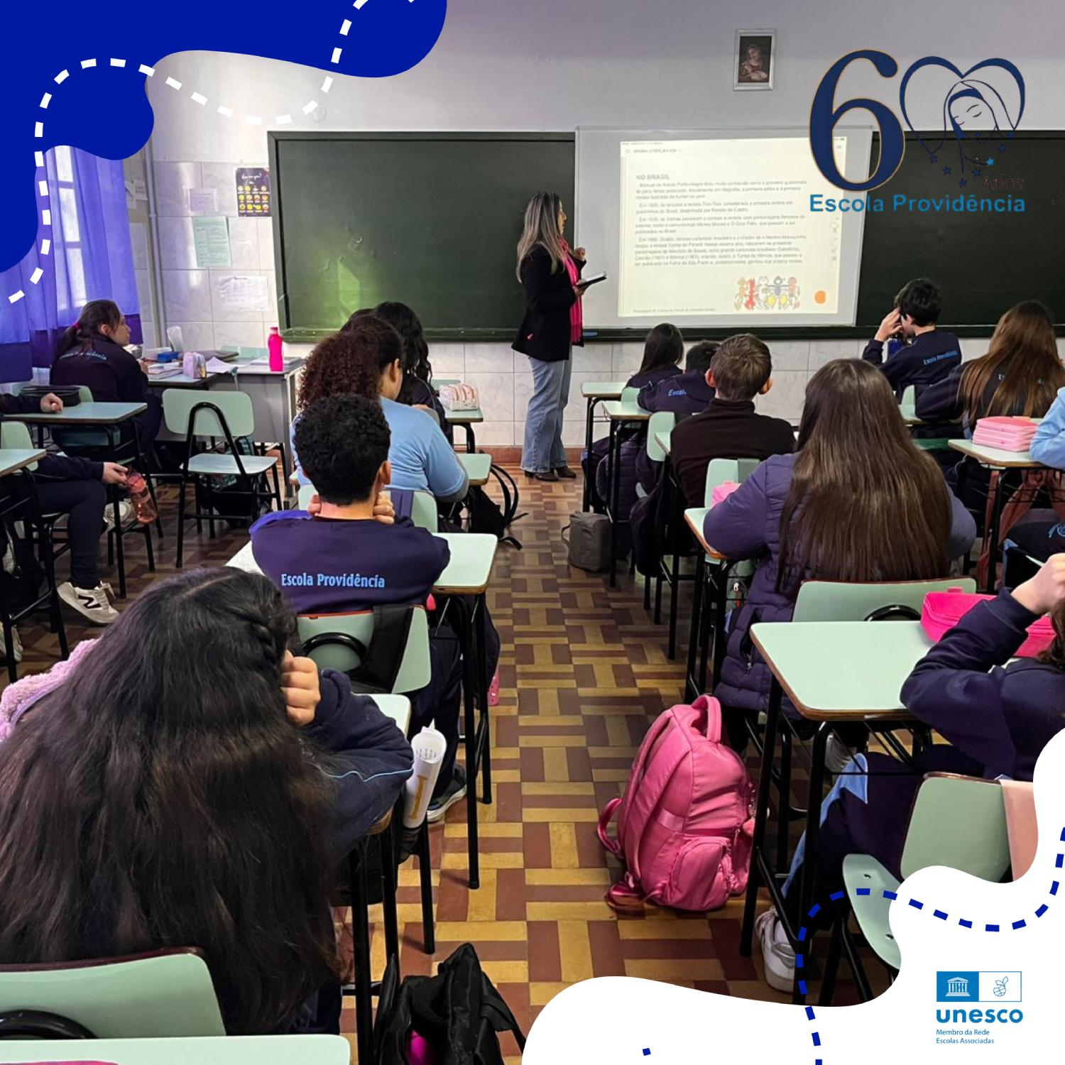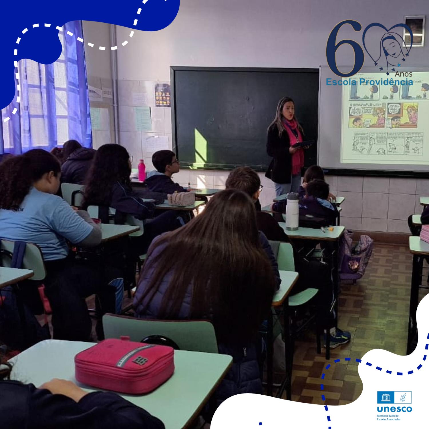 No 6º ano, os estudantes mergulharam em uma contextualização histórica e transformaram suas ideias em criativas HQ’s. Já no 7º e 8º ano, os alunos exploraram outro gênero textual, produzindo sinopses a partir da exibição de dois curtas.